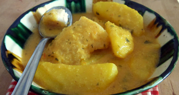 En la cubeta, con el aceite de freír todo lo anterior, se echan patatas cortadas a trozos grandes, laurel, azafrán, sal, el machacado y se cubre con agua, se programa el robot menú guiso, 30 min temperatura 1 y cuando le queden unos 5 min. para terminar se cascan unos huevos y se añaden