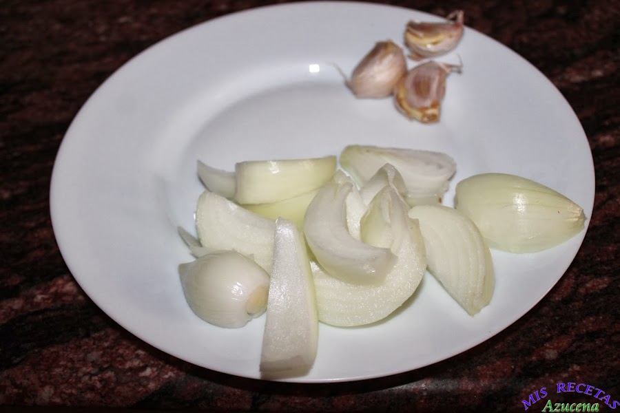 La cebolla la pelamos y la picaremos en gajos, reservamos.