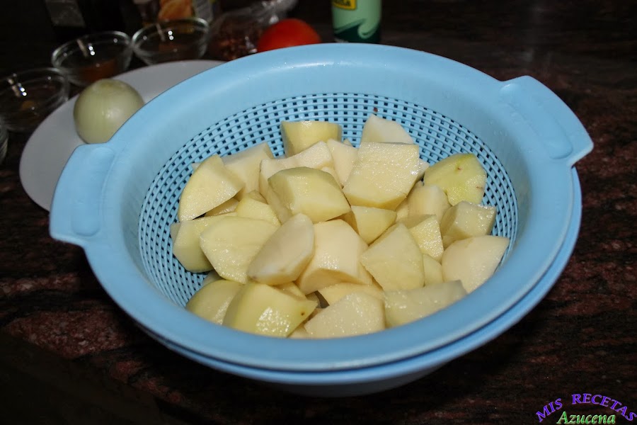 Pelamos las patatas y las picaremos en gajos no muy grandes, reservamos.