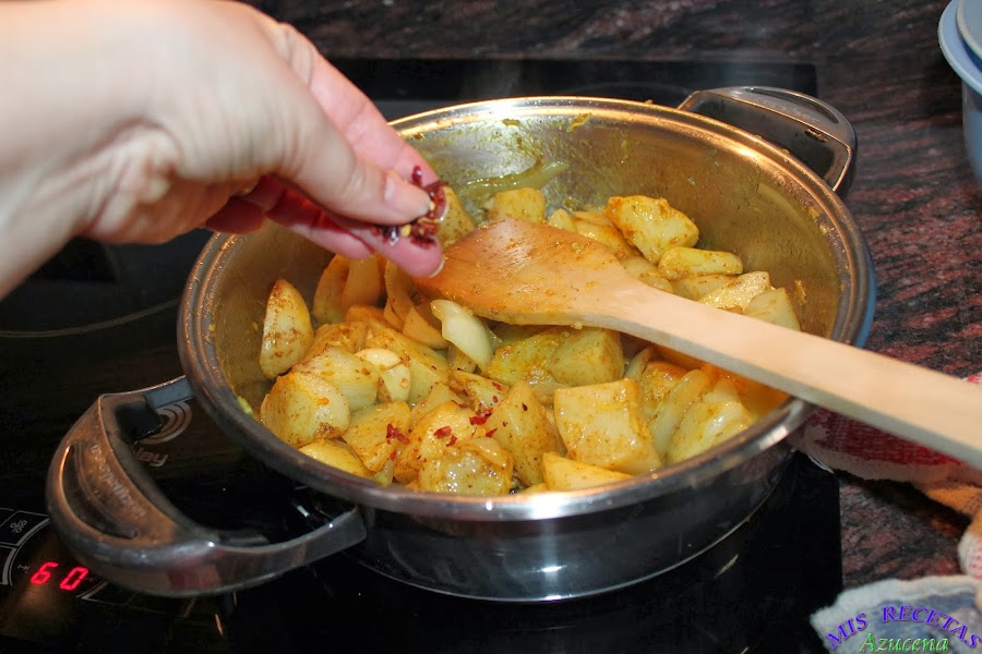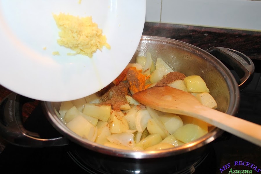 Pasados los 3 minutos añadiremos la cúrcuma, garam masala, comino, cilantro y la raíz de jengibre, removemos todo y dejamos sofreír 1 minuto.