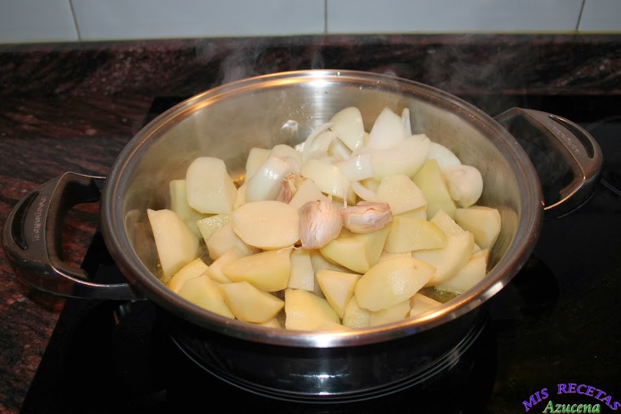 Ponemos una olla al fuego, a fuego medio, cuando este caliente añadiremos un fondo de aceite, las patatas, la cebolla y los ajos que antes de ponerlos los machacaremos un poco, removemos todo y dejamos sofreír durante 3 minutos.