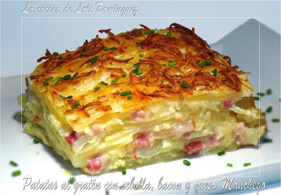 Patatas al gratén con cebolla, bacon y queso Manchego, riquísimo primer plato o acompañamiento para un pescado o filete de carne, en cualquier caso es una idea estupenda, preparar este plato siempre es un acierto y además se hace solo en el horno por lo que nos ahorra mucho tiempo.