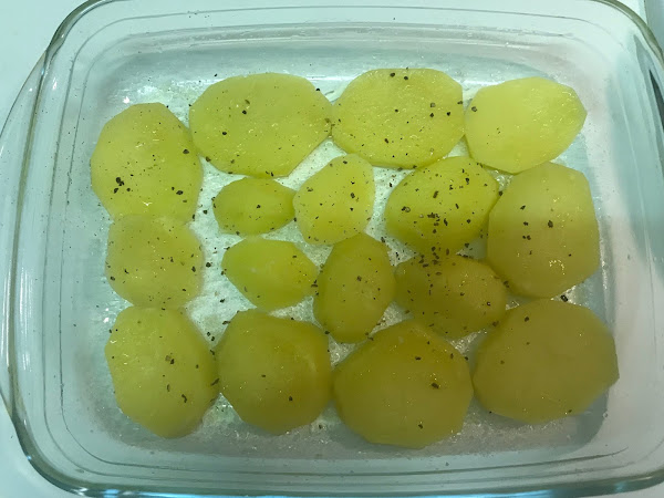 Pasados los 20 minutos de cocción, escurrir la patatas y cubrimos el fondo del molde con una capa de patatas, ponemos sal y pimienta.