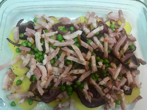 Sobre las patatas colocamos las tiras de cebolla, los guisantes y el bacon.