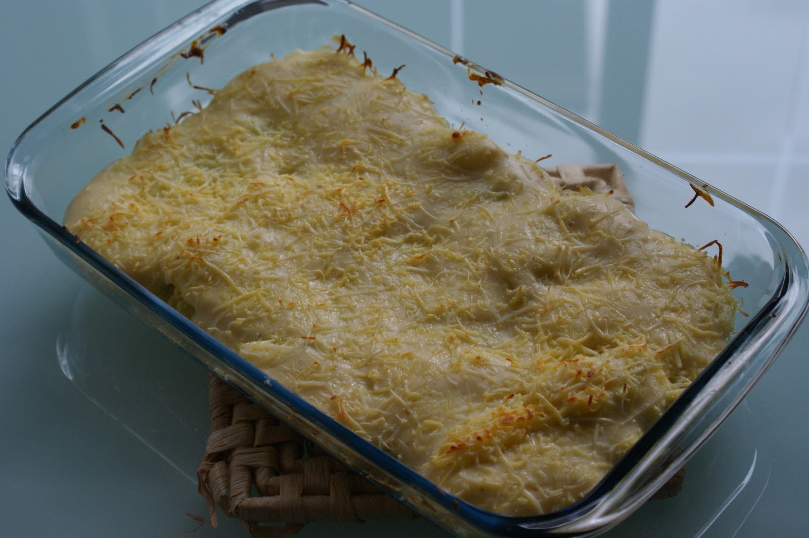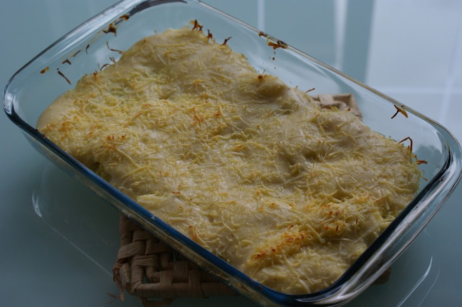 Hacemos una bechamel que haremos poniendo en un recipiente al fuego y en frio el aceite, la mantequilla, la harina, la leche y el caldo, removemos constantemente y hacemos durante 5 minutos. Frotar con el ajo? una fuente de horno y a continuación colocar una capa de patatas y cubrir con la bechamel y el queso, de nuevo hacemos capas hasta acabar los ingredientes.