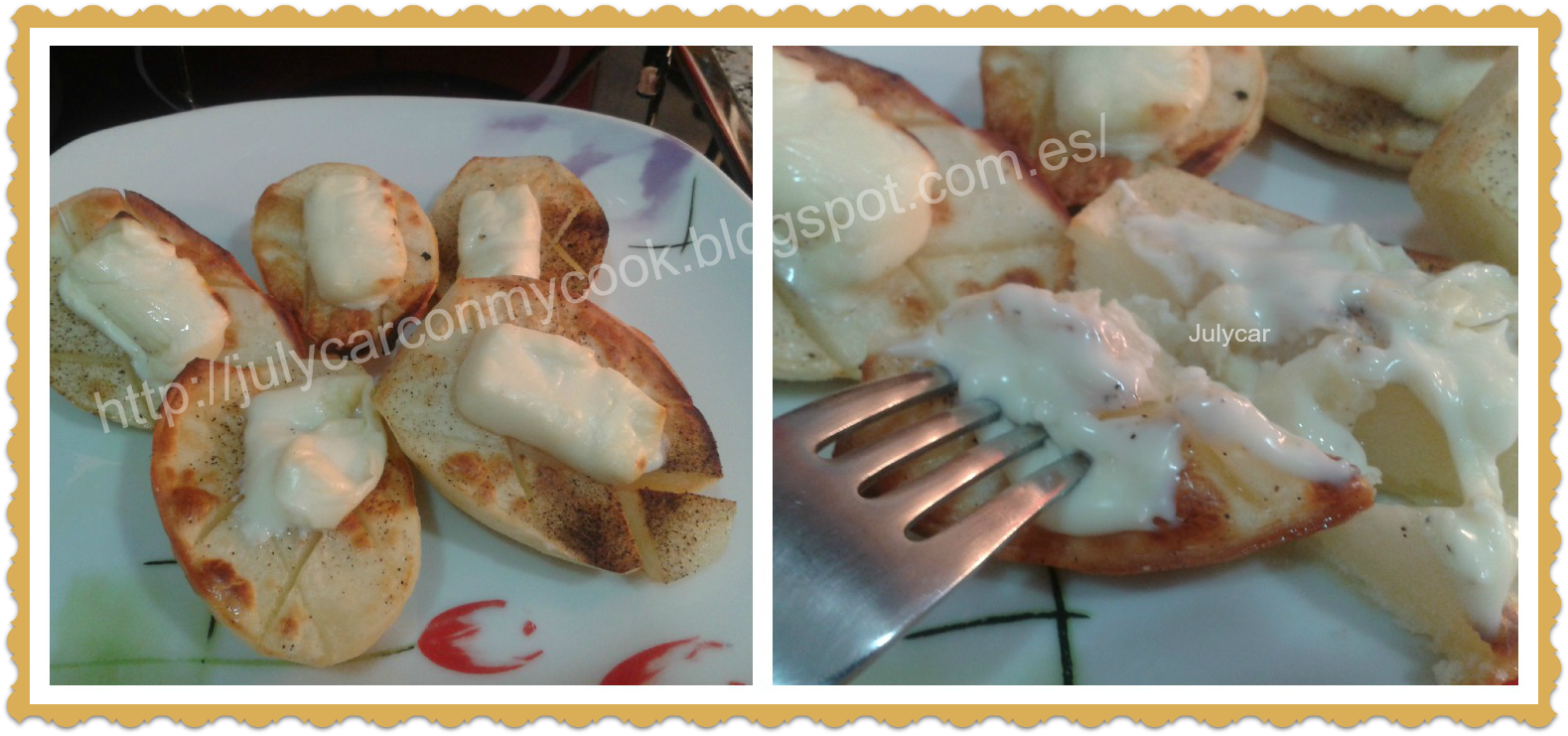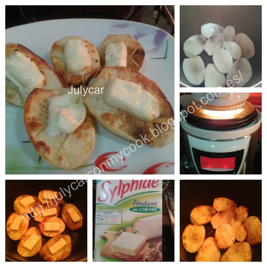 Pelar las patatas, partir por la mitad, hacer unos cortes transversales, meterlas en la cubeta de la cocimix deluxe, salpimentar, añadirle por encima un chorito de aceite de oliva, a cada patata, tapar con la tapa doradora, programar la olla menu horno, 140º, 20 minutos, la tapa doradora 250º, 20 minutos (trabajan juntas al mismo tiempo) cuando termine, añadir sobre cada patata un trozo de queso y gratinar con la tapa doradora, sacar y listas para comer