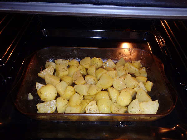 Asamos las patatas en el horno precalentado a 180º durante unos 40 minutos o hasta que esten tiernas por dentro. Puedes comprobarlo pinchando con un palillo.