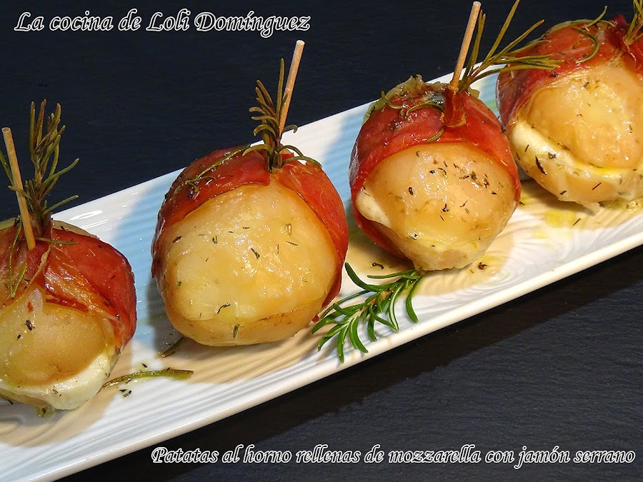 Le retiramos la piel a las patatas, las partimos por la mitad y con una cucharilla les retiramos un poco de carne del interior para dejar una pequeña cavidad, cortamos en porciones el queso mozzarella (aunque podemos poner el queso que más nos guste) salpimentamos las patatas por el interior al gusto, rociamos con un poquito de aceite y espolvoreamos con tomillo, le colocamos la mozzarella en el interior y cubrimos con la otra mitad de patata, envolvemos con una o dos lonchas de jamón serrano cada patata, pinchamos un palillo para que se sujete el jamón y pinchamos también una ramita de romero fresco en cada patata, en una bandeja de horno ponemos un poco de mantequilla restregada en el fondo, espolvoreamos sobre la mantequilla un poco de tomillo y romero, colocamos en la bandeja las patatas ordenadamente y repartimos por encima un poquito de romero y tomillo, con el horno precalentado a 175 grados con calor arriba y abajo, las dejamos hornear a la misma temperatura durante unos 15 a 20 minutos.