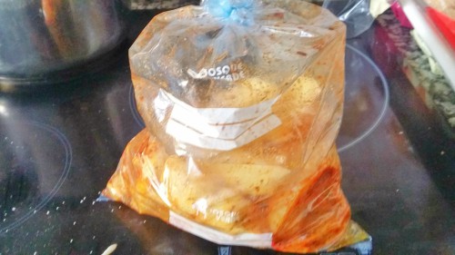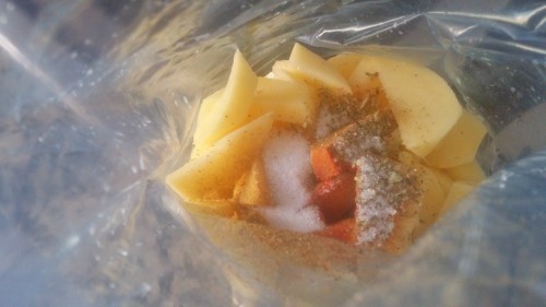Hinchamos un poco la bolsa, que haya aire, y la cerramos. Agitamos bien bien bien para que todos los aderezos embadurnen cada gajo de patata, y ya tenemos todo listo para ir al horno.