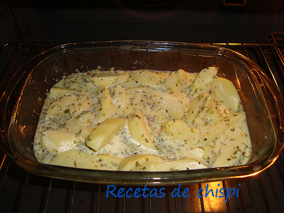 De vez en cuando remover las patatas con una cuchara para que se horneen por igual.