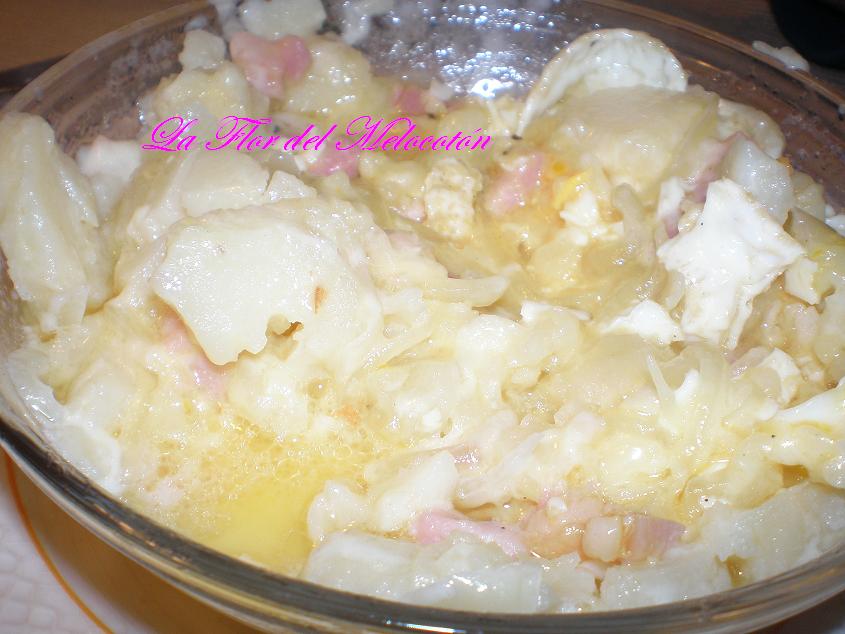 Sacamos las patatas del micro y ponemos en un recipiente adecuado, la nuez de mantequilla y un chorrito de aceite. Le añadimos la cebolla y lo ponemos 1" 30" en el micro, lo sacamos, movemos y volvemos a poner otro 1" 30". Si al sacarlo vemos que la cebolla no está aún no pasa nada. Le añadimos el bacon y lo volvemos a poner más o menos el mismo tiempo.