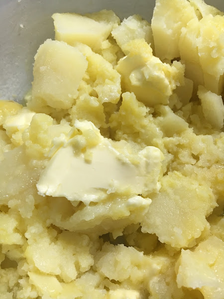Se cortan en cuadrados y se ponen en un bol junto con la mantequilla. Si están calientes las patatas, la mantequilla se derretirá con ellas. Se agrega la nata (crema de leche) líquida.