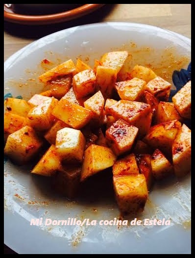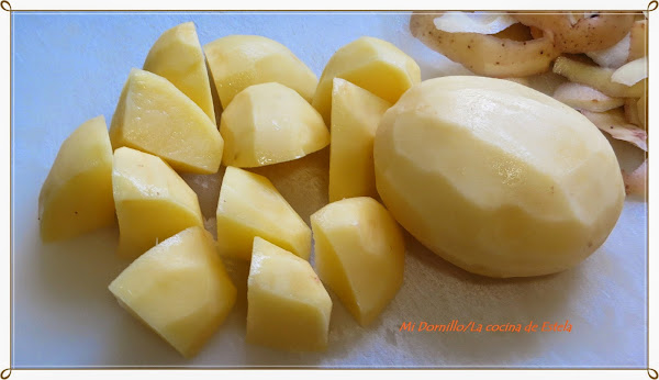 Pelamos las patatas y cortamos como mas nos gusten, yo las pique a cuadraditos.