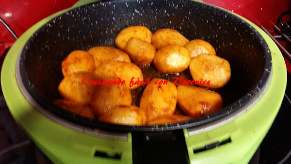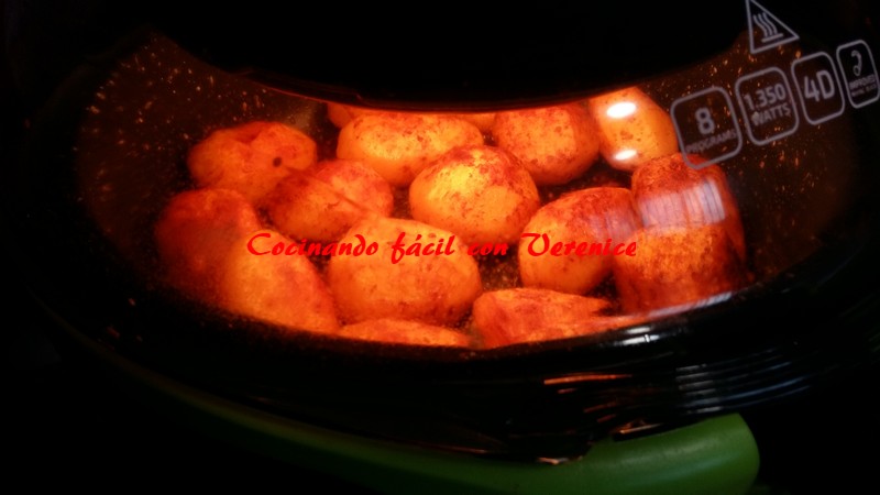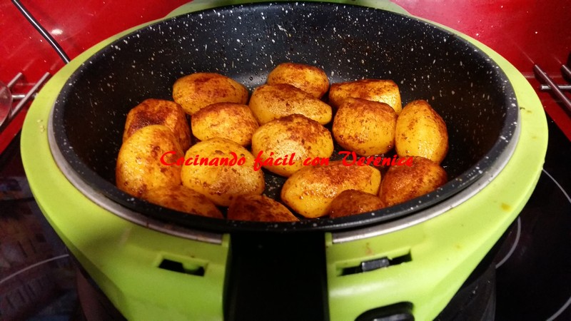 No remover las patatas con espátula cuando se están haciendo, se levanta la tapadera, se saca un poco la cubeta y se saltean.
