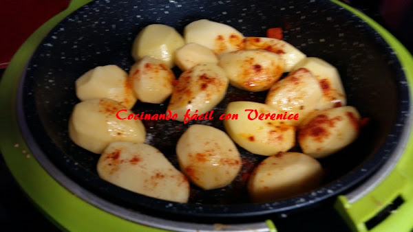 Con una brocha pintamos cada patata con el aceite, se salan (al gusto) y se le rocía el pimentón por encima. Yo le puse picante, se puede cambiar por dulce.