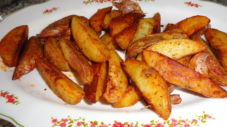 Se ponen a freír las patatas cortadas en gajos gorditos, también echamos en la sartén unos ajos con piel, pero un poco machacados. Se ponen a fuego lento para que queden blanditas y se hagan por dentro, cuando las pinchemos y estén tiernas se sube a fuego fuerte para dorar por fuera. Una vez fritas y cuando todavía estén calentitas se colocan en un bol, también los ajos, y se espolvorean de pimentón, comino molido, orégano y sal. Están riquísimas y al que le gusten los ajos..." guenos, guenos."