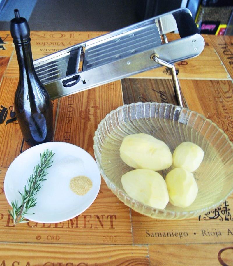 1. Con ayuda de una mandolina o cuchillo muy bien afilado vamos a cortar nuestras patatas en rodajas lo más finas posibles. (mirar en NOTAS)