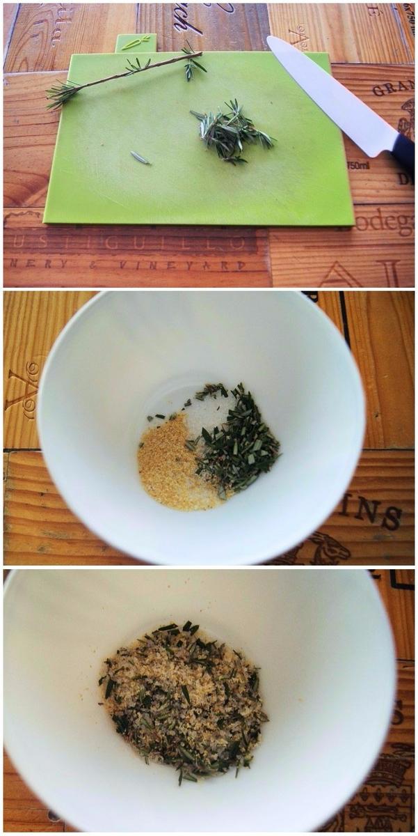 4. Ahora picaremos las hojas de romero fresco bien picaditas y mezclamos con la sal y el ajo en polvo.