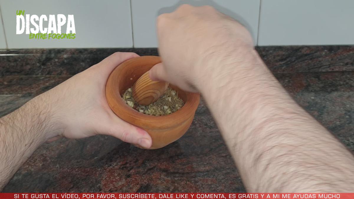 2Ahora, en un mortero añadimos una cucharada de romero seco y una pizca de sal, machamos un poco para que el romero suelte su aroma. Después, picamos finamente un par de dientes de ajo y lo añadimos al mortero y volvemos a machacarlo todo. Ahora añadimos una pizca de pimienta negra y el aceite de oliva y mezclamos todo.