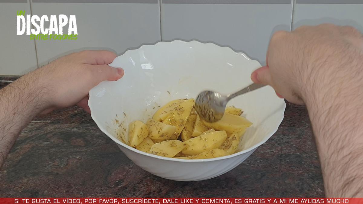 3Ahora añadimos la mezcla al recipiente con las patatas y mezclamos bien para que las patatas se impregnen bien de la mezcla, y reservamos unos 5 o 10 minutos para que las patatas vayan absorbiendo los aromas. Mientras reposan las patatas, precalentaremos el horno a 200º centígrados.