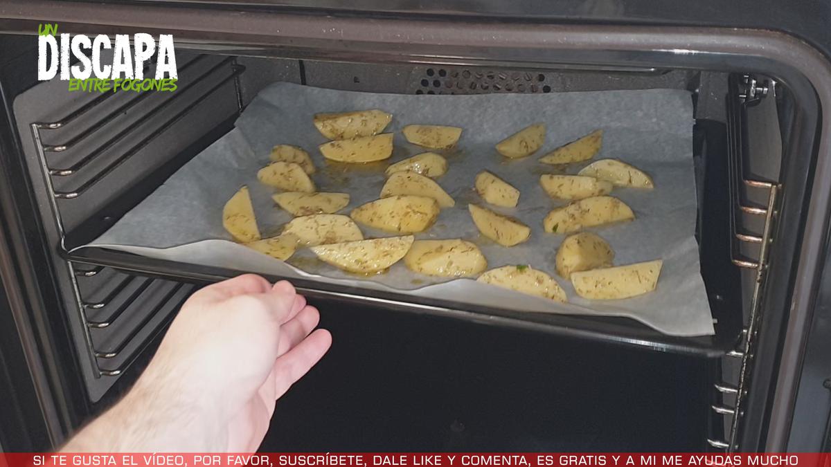 4Pasados unos 10 minutos, ponemos las patatas en una bandeja de horno y las horneamos a 200º con calor arriba y abajo durante 30 minutos.