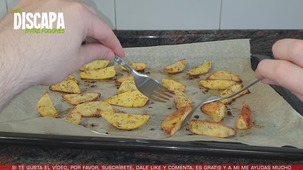 5Pasados 30 minutos, le damos la vuelta a las patatas y las horneamos por 15 minutos más.