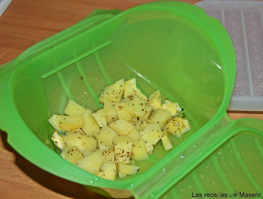 Como recipiente usé el estuche de vapor. Podríais usar un plato hondo tapado con otro, pero aparte de no ser ya "patatas al vapor", la receta serían las patatas a las hierbas provenzales que ya publiqué en el blog (ver receta aquí).