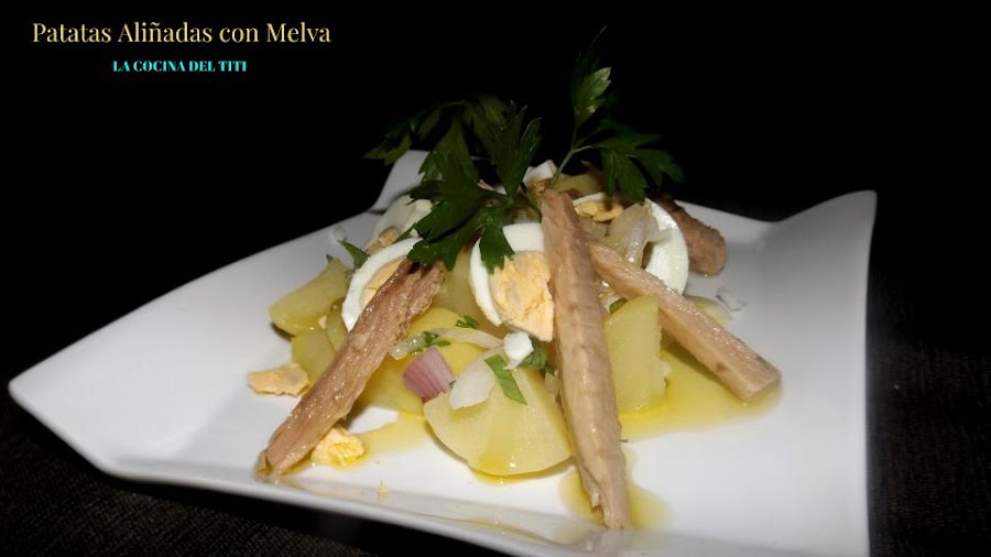 4º Aliñamos con el aceite, el vinagre, el perejil, la cebolleta y la sal. Por ultimo añadimos la melva.