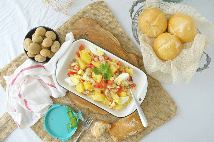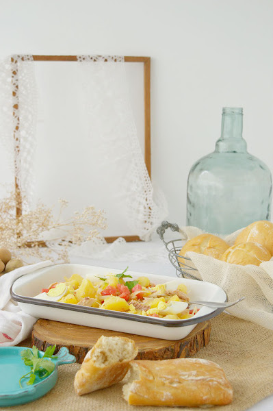 Pues todo esto es lo que me ha pasado este mes al preparar estas papas aliñás (patatas aliñadas) a mi estilo sevillano. A lo mejor me dices, pues así no la hago yo, pues yo le echo tal y cual,... Creo que las patatas aliñadas tienen muchas variantes, tantas como gustos, ¡jeje! En la mayoría de los bares y casas sevillanas las verás hechas de esta manera aunque puede también que las encuentres más al estilo gaditano, sin tomate ni pimiento, ni atún o melva,... sólo patatas, cebolla, huevo y perejil. Deliciosas también.