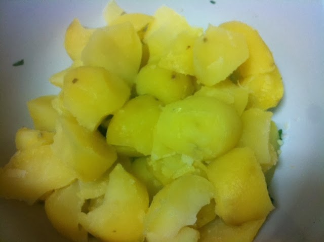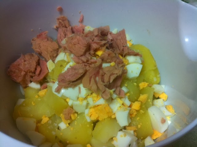 Pelar las patatas y los huevos una vez fríos. Cortar las patatas y los huevos y añadir al bol.
