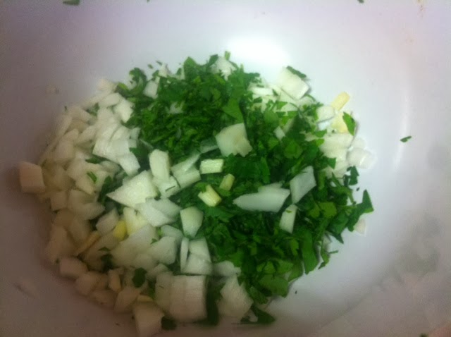 Mientras, cortar en brunoise (daditos pequeños) la cebolleta y picar el perejil y echar todo en un bol, junto con el atún escurrido.