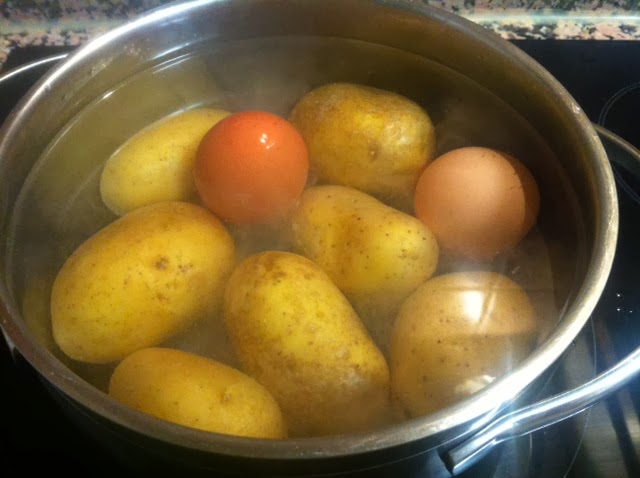 Poner en una cazuela las patatas y los huevos y cubrir de agua. Poner al fuego con sal gorda y cocer (desde que empiezan las burbujas) unos 20-25 minutos.