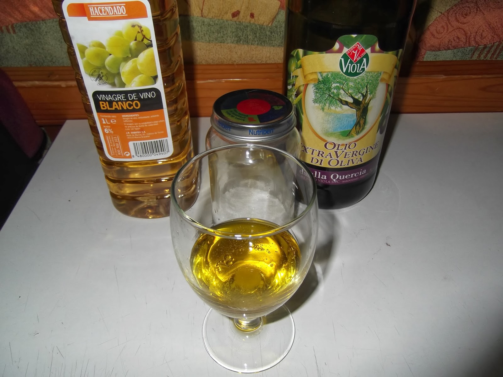 Cuando ya están cocidas las patatas, las dejáis enfriar un poco, las peláis, las cortáis y las echáis a un bol. Mientras tanto elaboráis la vinagreta, con el doble de aceite que de vinagre y la sal. Lo emulsionáis, es decir lo batís un poco para que se mezclen todos los ingredientes; lo ideal sería hacer esto siempre cada vez que vamos a realizar una ensalada, aunque no siempre lo hacemos y se lo echamos directamente.