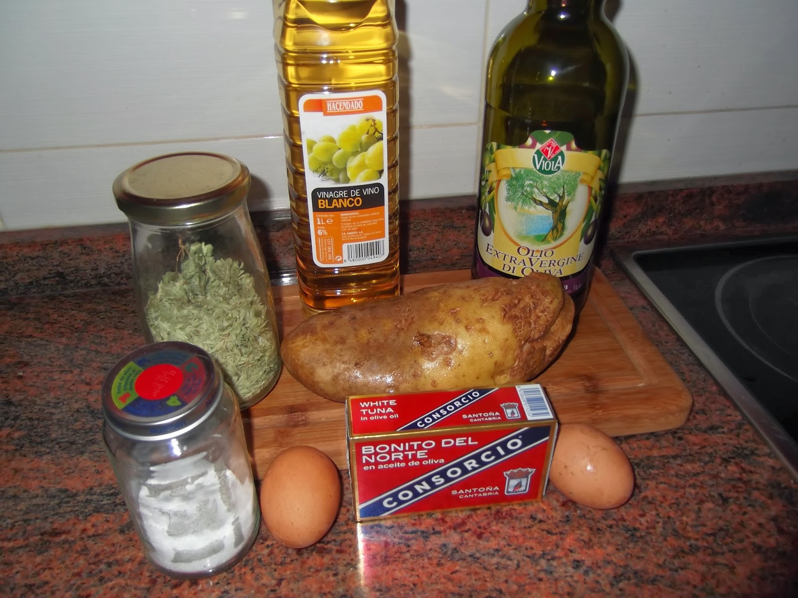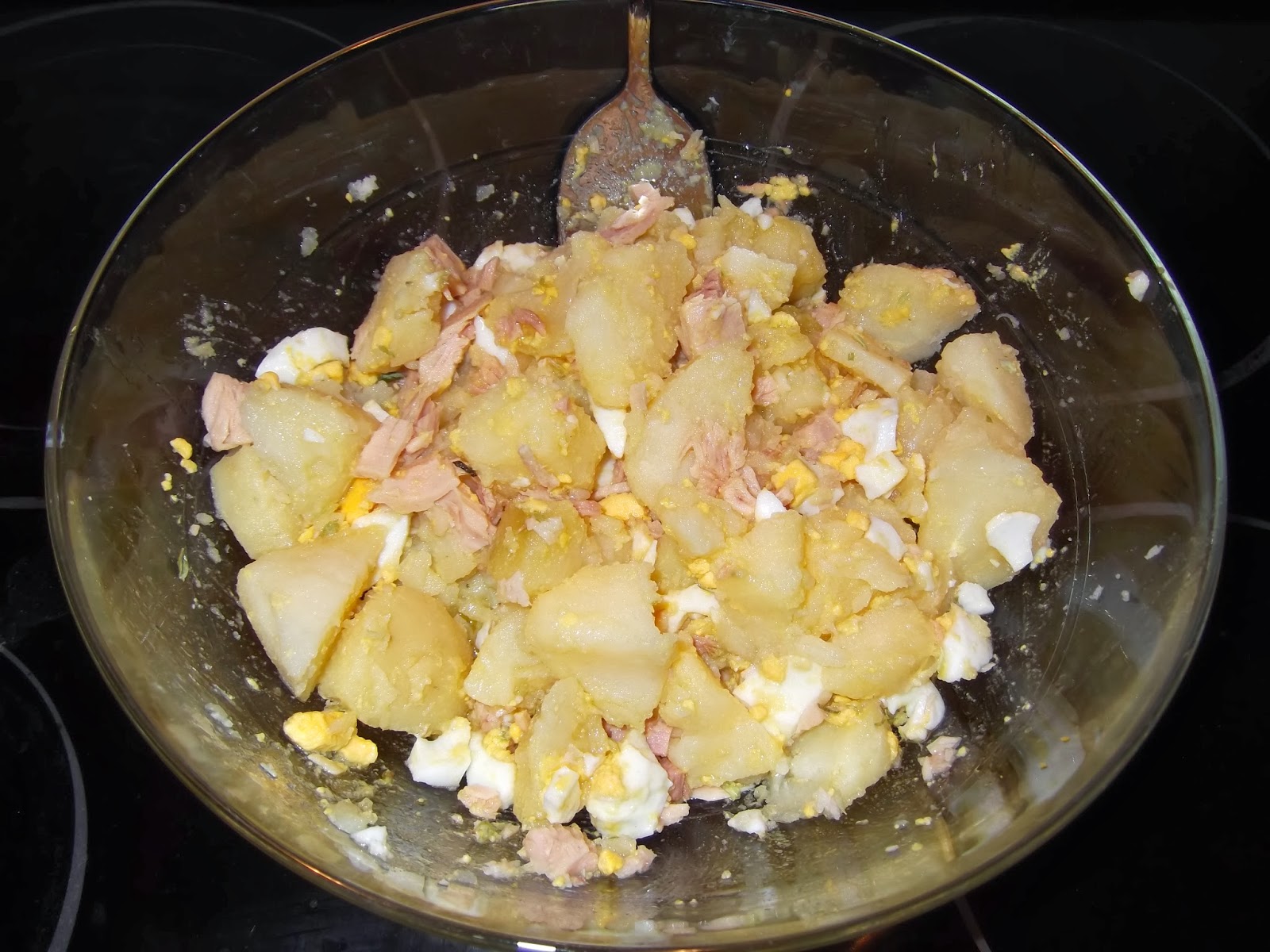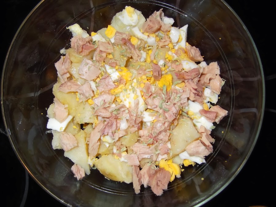 Una vez que tenemos la vinagreta se la echamos por encima a las patatas, luego pelamos los huevos cocidos y se lo añadimos también en trozos pequeños, al igual que el atún desmenuzado. Echar también el contenido de la lata, aquí os lo dejo a vuestra libre elección si os gusta más en escabeche emplear este tipo de atún o si no utilizarlo en aceite.