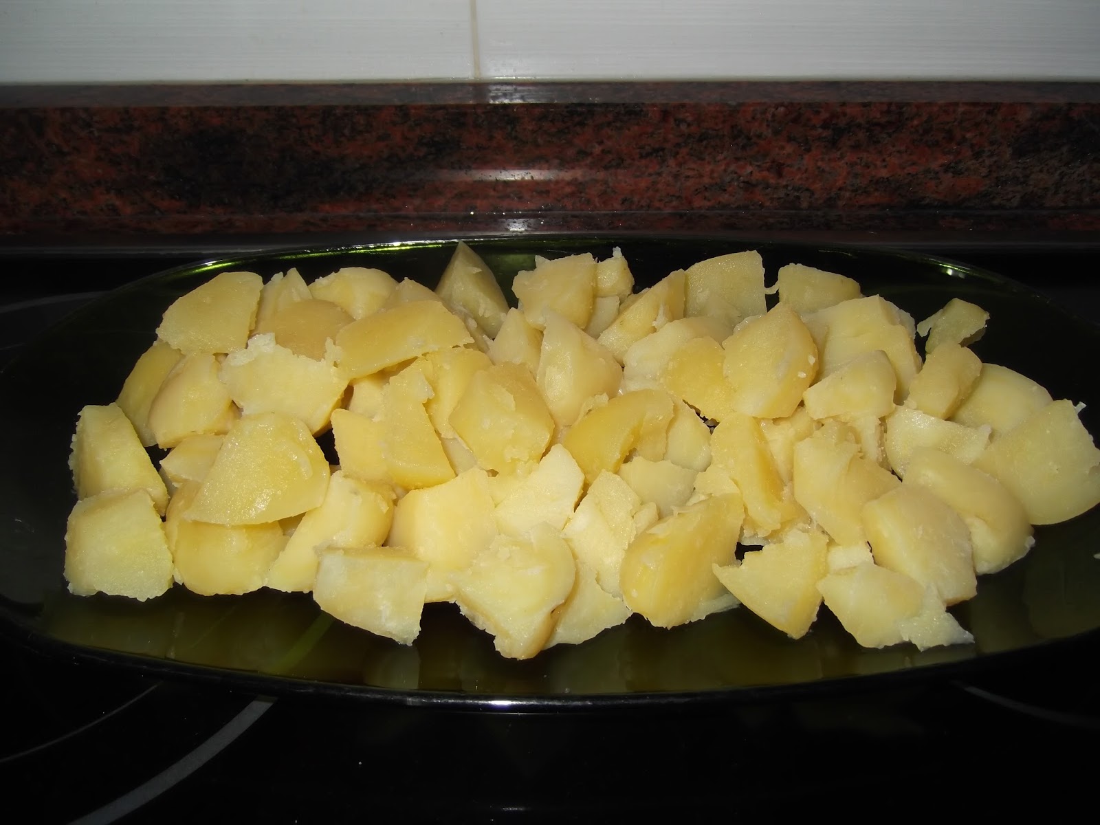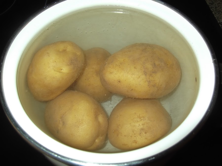 Lo primero que hacemos es cocer las patatas en una cacerola con agua y un poco de sal. En función del tamaño de las patatas tardarán más o menos en cocerse, yo laS tuve media hora. Sabréis que están listas cuando pinchéis un cuchillo y veáis que están blandas. A continuación, dejáis que se enfríen.