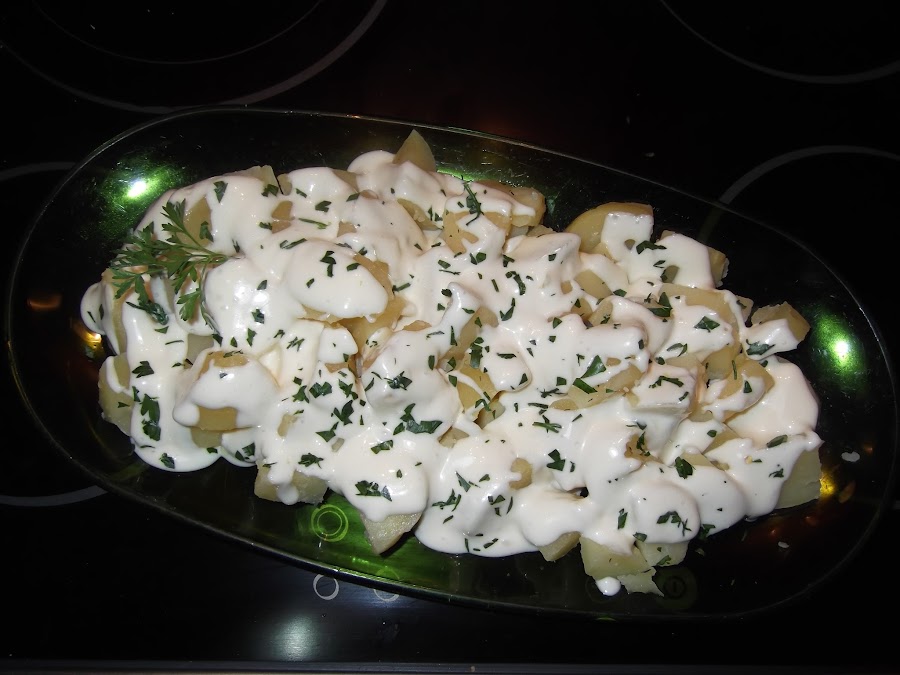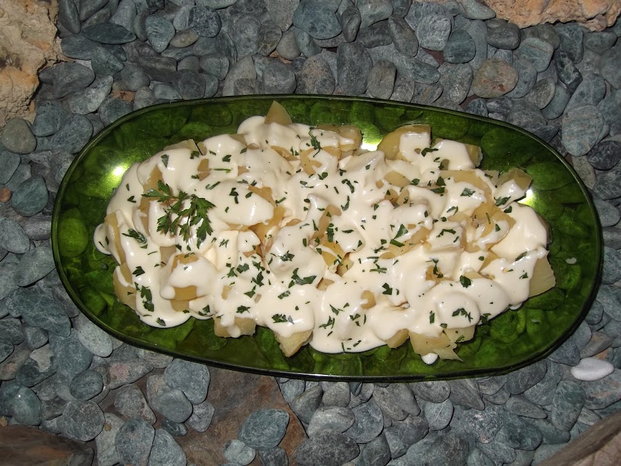 El siguiente paso es pelar las patatas y echarles por encima bastante alioli y perejil muy picado para que las patatas queden impregnadas. Y ya están listas para degustar, se pueden cocinar con antelación y tenerlas preparadas para cuando lleguen vuestros invitados.