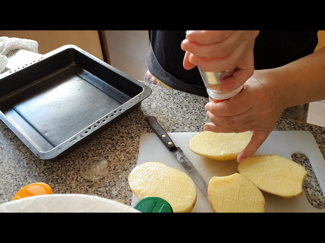 12. Y vamos depositando encima de él nuestras patatas con la cara aliñada hacia abajo.