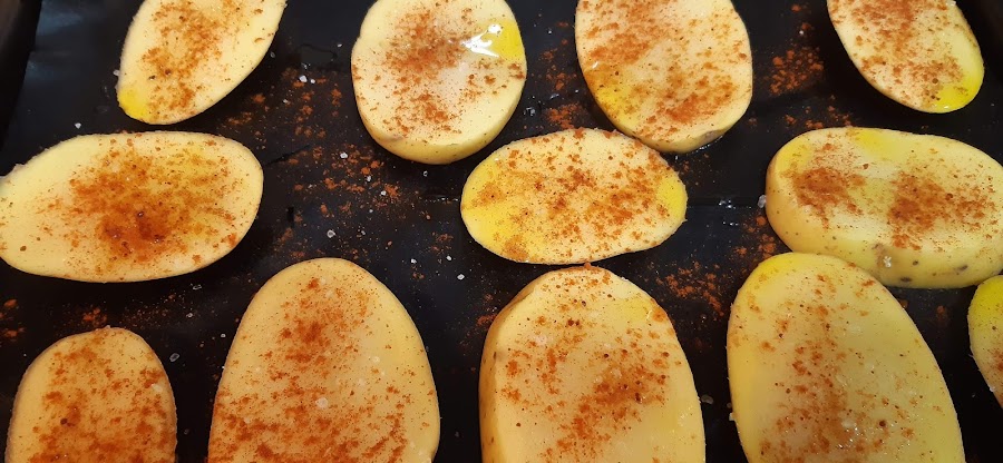 4.- Colocamos las rodajas en una bandeja con papel de hornear y las rociamos con el aceite, les echamos la sal y el pimentón.