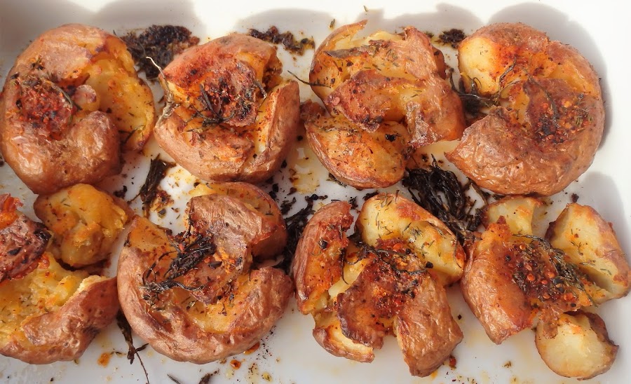 Cuando ya tenemos las patatas cocidas las escurrimos y las reventamos apretando con el dorso de una cuchara, de manera que la piel reviente y se abra pero queden aún enteras. Así perderán mucho vapor y se secarán quedando bien crujientes por fuera, también sire para que el interior absorva los condimentos quedando bien sabroso.