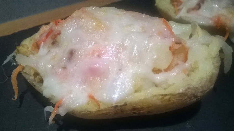 Ya han pasado los 10 minutos, ahora abrimos las patatas por la mitad y con cuidado quitamos el interior de las patatas. Cuando tengamos ya el hueco preparado, en la base del hueco echamos sal, romero y la salsa cesar, después echamos la mezcla que prepararemos con lo que nos ha sobrado de las patatas, la zanahoria rallada, el beicon, la cebolla caramelizada y los brotes de soja. Ahora cogemos el queso rallado y lo echamos por encima, lo volvemos a meter en el microondas en modo grill durante 5 minutos.