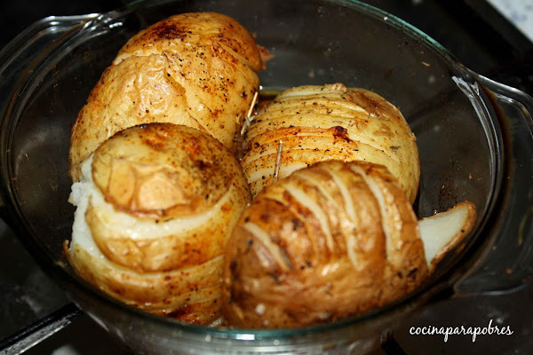 Esta forma de preparar las patatas, los cortes en forma de acordeón, facilita la cocción y la entrada de sabores dentro de la patata. De este modo conseguimos que las patatas queden crujientes por fuera y muy suaves por dentro.