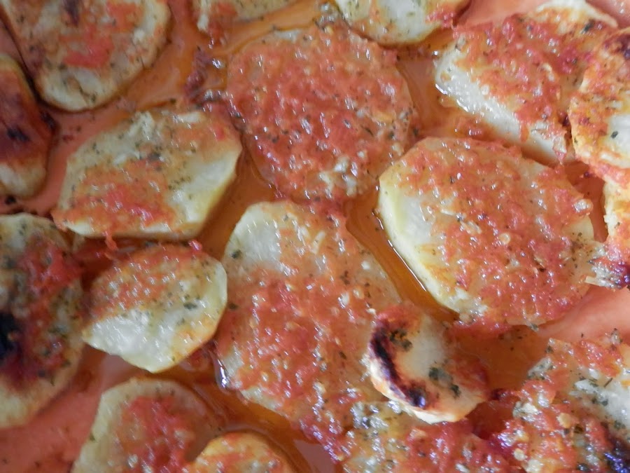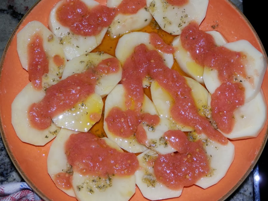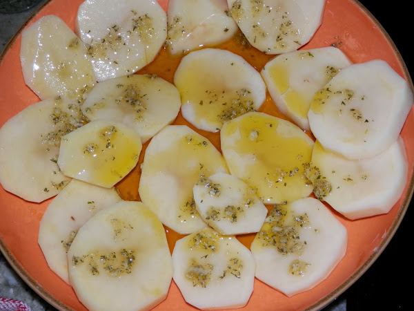 Sacamos las patatas y metemos en el microondas ahora las caballas a las que habremos añadido otro poco de la picada de ajo, sal, perejil y aceite y las ponemos durante tres minutos, cuando salte el temporizador las dejamos reposar dos minutos y las metemos otra vez durante otros dos minutos más.