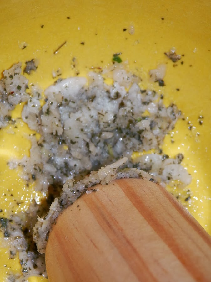 Distribuimos las patatas en un plato y ponemos encima el majado de ajo, sal, perejil y aceite.