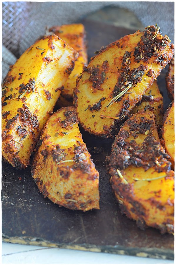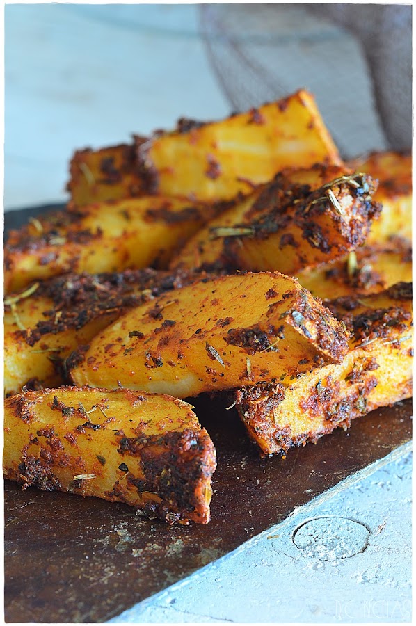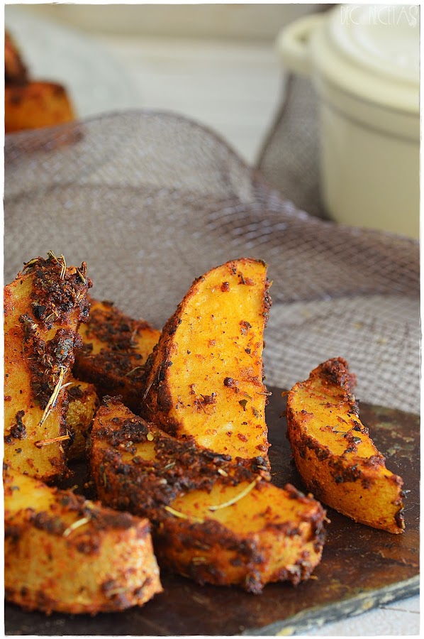 Primero cortamos las patatas en gajos sin pelar las y las metemos dentro de un bol con agua fría unos 5 minutos. Las escurrimos y las apartamos. En ese momento dentro de una bolsa de zip introducimos 2 cucharadas de ajo en polvo, una cucharada de pimentón dulce y otra de pimentón picante, dos cucharadas de hierbas secas de tengáis por casa coma pimienta al gusto, sal y por último como 4 cucharadas de aceite de oliva virgen extra. Introducimos las patatas dentro de la bolsa de zip, la cerramos y mezclamos todo conjuntamente para depositarlas en una bandeja de horno y llevarlas al mismo a 180 grados con calor arriba y abajo durante media hora.