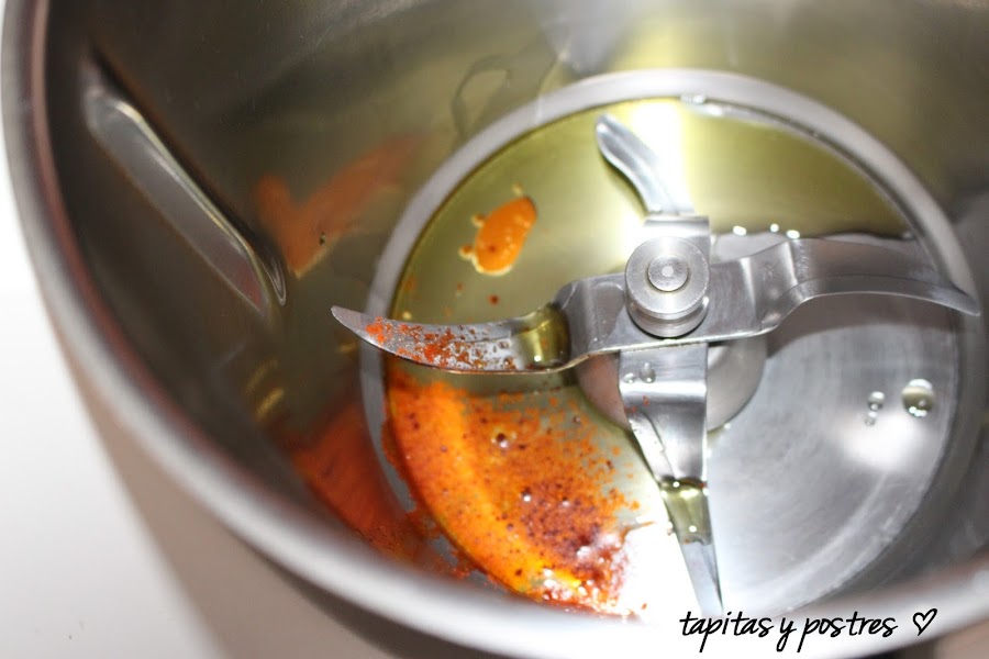 PREPARACIÓN:Ponemos en el vaso de la thermomix el aceite, , el pimentón, el tabasco y el vinagre y lo calentamos dos minutos, 100º a velocidad 2. En caso de querer usar guindilla, la añadimos troceada aquí.