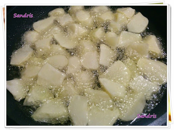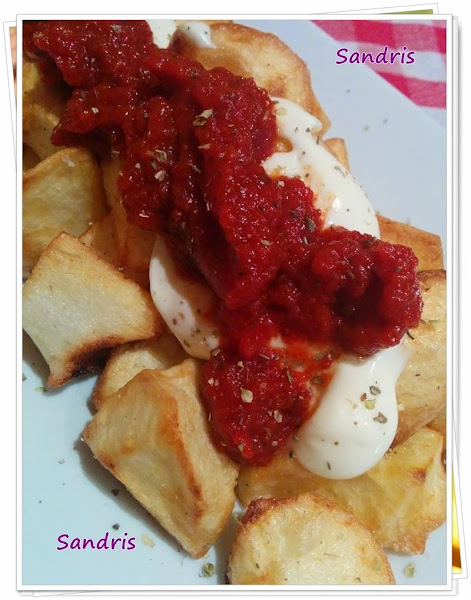 Y como no... las patatas bravas es una de las tapas por excelencia en este país. Hay sitios que las hacen tan ricas... la patata jugosita por dentro y crujiente por fuera, la mayonesa con un gran sabor (incluso ajoaceite que yo lo prefiero) y la salsa brava o tomate... con un toque picante espectacular!!! Algunos les ponen pimentón en polvo por encima, otros usan ketchup picante, otros salsa de tomate, otros presentan las bravas con las dos salsas por separado, otros las prefieren presentar una vez ya mezcladas... Desde luego que hay mil formas de presentarlo y yo he decidido al final hacer mi propia salsa de tomate picante para unas bravas bien jugositas y crujientes.