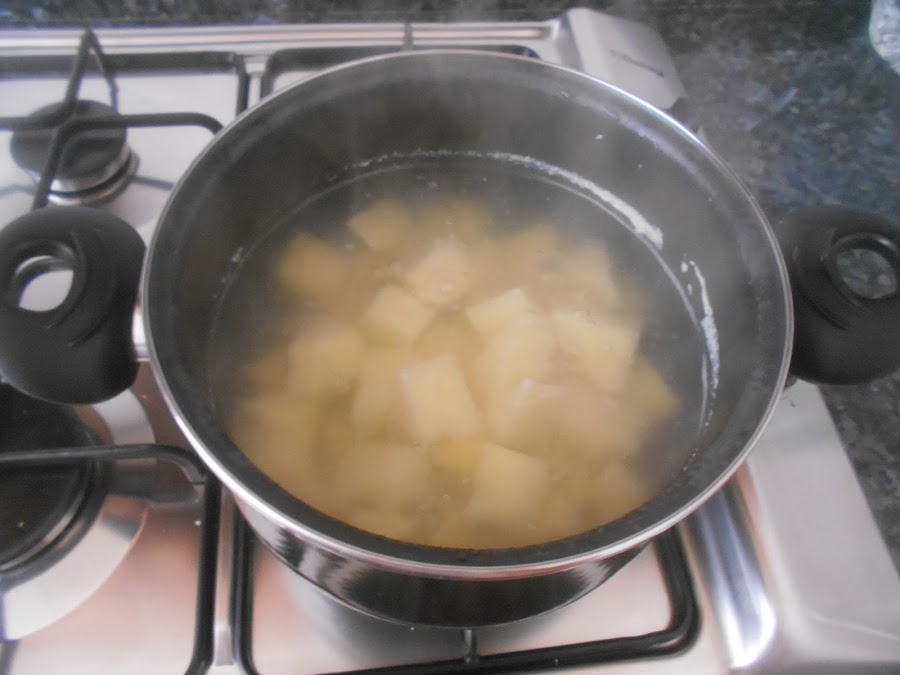 Os cuento mi truco. Para que las patatas queden tiernas y bien cocinadas con este tipo de corte previamente hay que hervirlas.