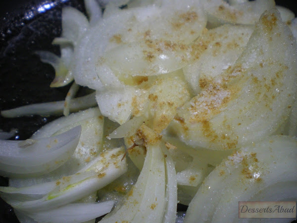 Cortamos la cebolla en juliana muy fina y la caramelizamos en una sartén con un poco de aceite de oliva, añadiendo el azúcar, el jemgibre y la sal.
