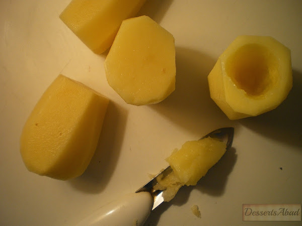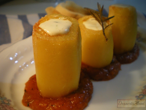Sobre cada montoncito de salsa de tomate colocamos las patatas ahuecadas y las rellenamos con el alioli.