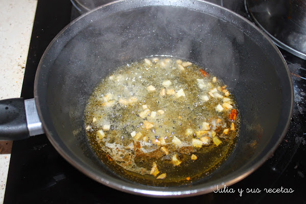 En una sarten ponemos un poquito de aceite y sofreímos el ajo picado y las cayenas.